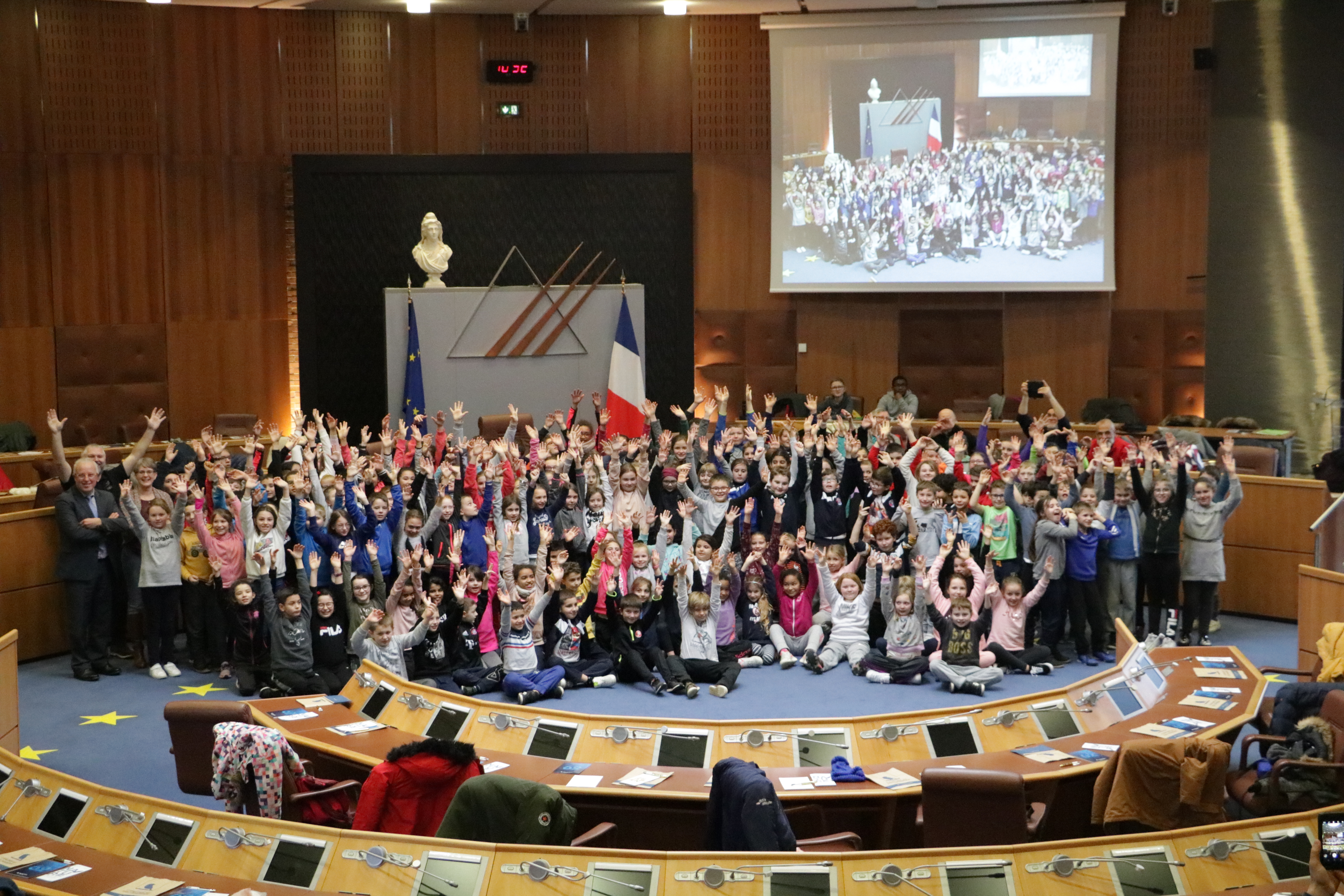L'après-midi, place au début associatif au sein de l'hémicycle de notre département ! Tout ébahis, nos usépiens y ont été accueillis par Mme DRAIN, Vice présidente du Conseil départemental du Pas-de-Calais. Cette année ils ont pour objectif de créer un flyer en faveur des enfants de l’Ecole : "Pourquoi venir à l’USEP ?"